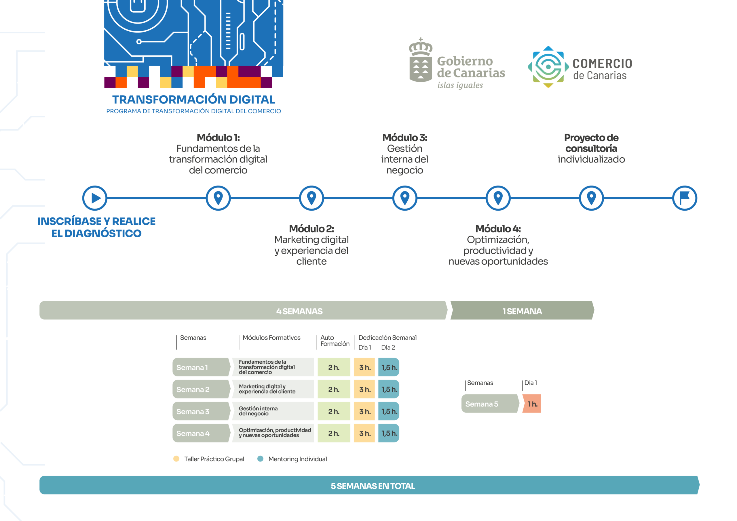 La duración total del programa es de 5 semanas, garantizando flexibilidad horaria y compatibilidad con la actividad ordinaria de los negocios participantes.